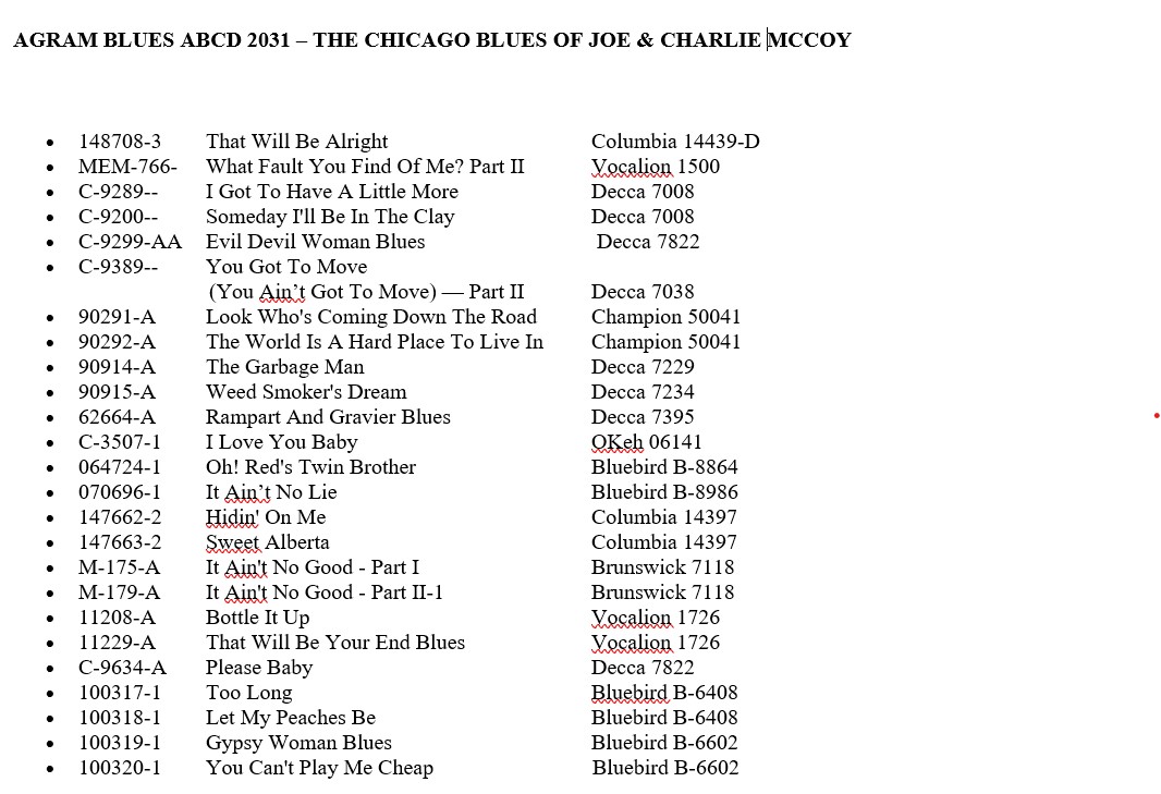Of all the books in this series by Guido van Rijn, this study of the lives, musical styles, and recordings of “blues brothers” Joe and Charlie McCoy has been the most problematic and difficult to bring to completion and publication. Some of the problems were simply due to the volume of material the two artists recorded, the difficulty of obtaining listenable copies of some songs, and further difficulties of understanding their lyrics, the latter especially in the case of brother Joe. For two artists who recorded prolifically, both separately and together, over a period of about a decade and a half, and who composed and/or performed on many hit records, the McCoy brothers are little mentioned by others who knew them and are generally mentioned only in passing by blues researchers. They remain unjustifiably in the shadows of blues history, while their contemporaries and collaborators, such as Bo Carter, Tommy Johnson, Ishman Bracey, the Mississippi Sheiks, Memphis Minnie, Big Bill Broonzy, Washboard Sam, Johnnie Temple, Tampa Red, and Roosevelt Sykes, shine brightly in the blues firmament.