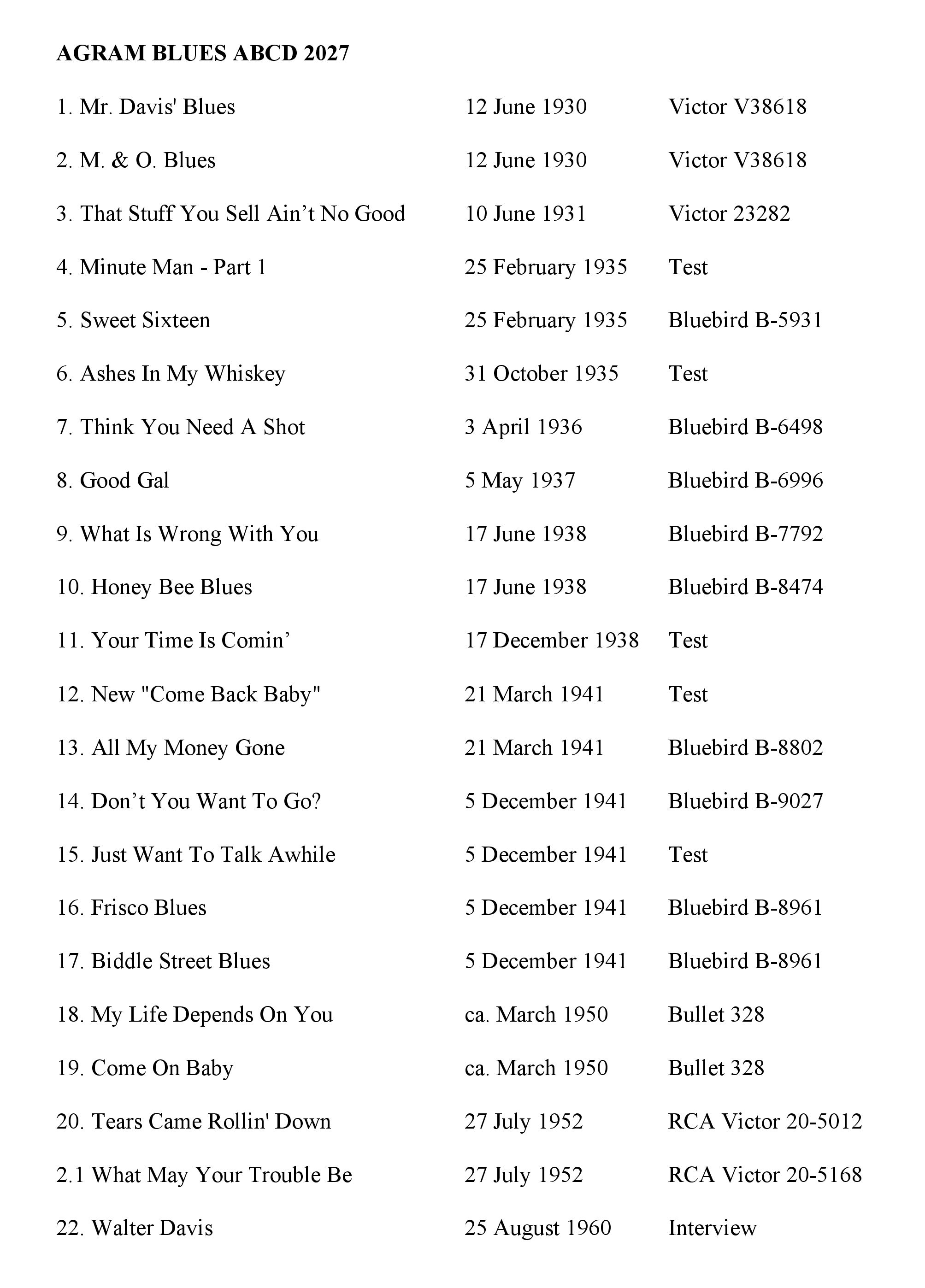 Hogg went from record company to record company without regard to contracts; Davis stuck with RCA Victor/Bluebird, apart from a brief engagement with Bullet Records between 1949 and 1951. In total 184 sides.